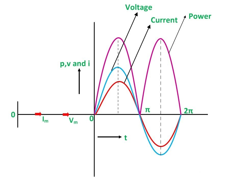 此外,如果我們檢查同一電路的圖形表示,從其功率曲線可以看出,任何時候功率周期的任何部分都不會變為負。因此,在純電阻電路中,功率永遠不會為零。此外,這是由于電流和電壓的瞬時值始終為負或正。同樣,純電阻電路的功率循環頻率是電流和電壓波頻率的兩倍。