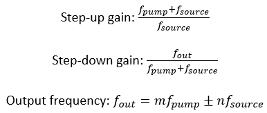 上面的參數(shù)放大器電路將通過混頻產(chǎn)生高次諧波和低次諧波。這些諧波在C3處產(chǎn)生,并輸出到惰輪電路中。僅通過使用非線性電抗組件(上面的變?nèi)荻O管)進行混頻。電路產(chǎn)生的每個諧波以及每個組件的增益在下面的公式中定義。