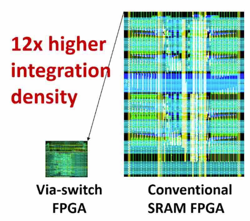 (大阪大學(xué)開發(fā)的Via-Switch FPGA與常規(guī)SRAM FPGA在尺寸和集成密度上的比較)