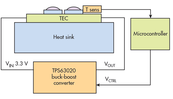 在整個系統(圖3)中,微控制器(MCU)監視TEC上的溫度傳感器。根據TEC的實際溫度與所需溫度(設定點),MCU調整控制信號(V CTRL),以將降壓-升壓轉換器移至新的工作點,以提供或吸收更多或更少的電流來調整溫度。