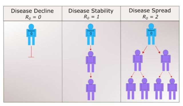 例如,假設某人A生病并且我們的系統的R0 = 2。這意味著A將感染兩個人。這兩個人將依次感染四個人,每個人將另外感染兩個人(因此4 * 2 = 8),依此類推。這凸顯了該疾病的傳播是乘法而不是累加的事實。R0可以捕獲三種基本情況,如圖2所示。