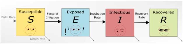 首先,要考慮一個島嶼,即我們的系統,不允許人們進出。每個人在給定時間都可以處于以下狀態之一:“易感”,“感染”和“已康復”,因此縮寫為SIR,因為從未患過該病(S)的人很有可能會生病并在一定時間內感染(I),然后恢復(R)。就新型冠狀病毒而言,將模型擴展為附加狀態“已暴露”是適當的,以包括具有病毒但尚未感染的人(SEIR模型)。