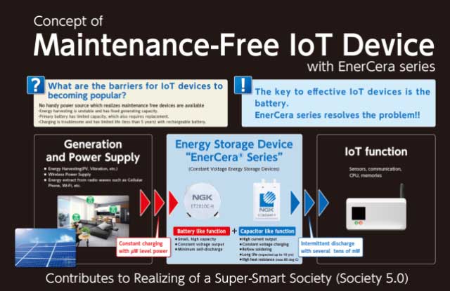 NGK副總裁Ohwada先生在討論EnerCera在實現免維護IoT概念方面的潛力時,強調了上述優勢:“我們的產品系列中的兩種型號都為具有以下特點的超小型/超薄IoT設備提供電源解決方案:市場上以前不存在。EnerCera囊袋超薄且可彎曲,可將其嵌入到柔性電路板中。另一方面,可以通過回流焊接將硬幣模型與其他電子組件一起安裝在電路板上,從而代替電容器作為分散的電源。”