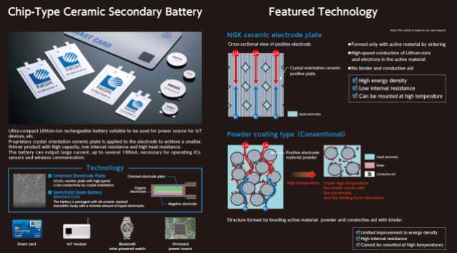 EnerCera有兩種類型:“ EnerCera Coin”,一種厚度為1毫米至2毫米的硬幣型電池,用于安裝在電路板上;“ EnerCera Pouch”,一種超薄且可彎曲的電池,厚度為0.4毫米至0.45毫米,用于嵌入卡。EnerCera硬幣是通過向其帶有電極和隔板的全陶瓷堆疊式整體中添加少量液體電解質制成的。NGK將這些獨特的電池定義為“半固態電池”。他們取得了世界上第一個工作溫度為85°C的鋰離子二次電池,使用壽命長達10年,這是對物聯網設備的兩個很大要求。