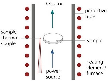 在上圖中,顯示了用于執(zhí)行LFA的設(shè)備的示例。圖中的示例代表了板材。該測試通常在封閉的機(jī)器中進(jìn)行,并通過軟件分析結(jié)果。關(guān)注的參數(shù)是熱擴(kuò)散率,可以使用以下公式確定: