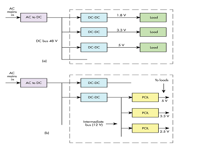 當今的電源系統使用兩種主要類型的體系結構:分布式體系結構和中間總線體系結構。圖1a示出了分布式布置。傳統的AC-DC電源會生成一條主DC總線,該總線已分配到設備的所有部分。IC和其他設備所需的DC電壓由負載點(POL)DC-DC轉換器/調節器產生。