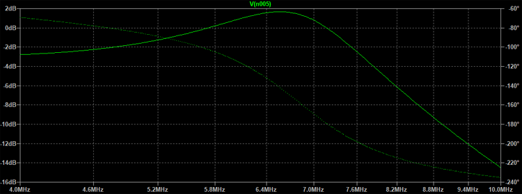 如您所見,濾波器的頻率響應(yīng)是一個低通,具有一個在14MHz的諧振峰,如果Q較低,則諧振峰是由濾波器具有較高的Q引起的,該濾波器將是沒有峰的低通。如果我們想要一個不同的Q,那么該濾波器將具有更高的帶寬,我們將需要使用PI濾波器,因為L濾波器的Q取決于源電阻和負載電阻。如果使用此電路來匹配電子管或晶體管的輸出阻抗,則需要從濾波器的電容器中減去輸出至地的電容,因為它們是并聯(lián)的。如果我們使用集電極-發(fā)射極電容(即輸出電容)為10pF的晶體管,則C的電容應(yīng)為19.1 pF,而不是29.1 pF。