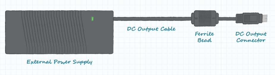 外部電源中的DC輸出電路使用內部并聯電容器來衰減電源輸出上的AC信號。一些電路設計可能還包括串聯電感器,以提供AC信號的附加衰減。但是,在最終的輻射測試中,可能會發現內部過濾不足以滿足EMI的法規要求。直流輸出電纜不進行傳導發射,但可以用作輻射發射的合理天線。解決過度輻射問題的一種解決方案是在直流輸出電纜上增加一個外部鐵氧體磁珠,以使電源符合要求。用于EMI濾波的鐵氧體磁珠旨在提供感抗和阻抗。無功阻抗有助于阻止不良信號的傳播,而電阻性阻抗會耗散一些與不良信號相關的能量。磁珠的選擇應使其物理上適合直流輸出電纜,并在相關頻率下提供必要的濾波特性。
