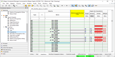 在上圖中,這四個網絡標記為紅色,因為貫穿這些網絡的最小值和/或阻抗值均超出34±5%范圍(32.3至35.7歐姆)。約束管理器顯示阻抗范圍為32.069歐姆至46.62歐姆;這些值可以出現在這些網上的任何地方。這可能是由于與其他導體的意外寄生耦合,走線寬度的變化或在參考平面上的間隙上布線引起的。