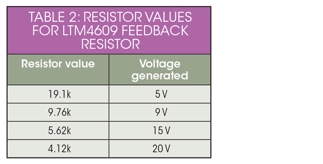電阻器網(wǎng)絡的作用是從USB Type-C PD芯片獲取控制信號,并為穩(wěn)壓器的反饋電阻器創(chuàng)建等效電阻。例如,假設您使用LTM4609降壓-升壓型穩(wěn)壓器作為標稱電壓為16 V的電池組中的穩(wěn)壓器。表2列出了電阻網(wǎng)絡必須為穩(wěn)壓器的反饋電阻生成的電阻值。