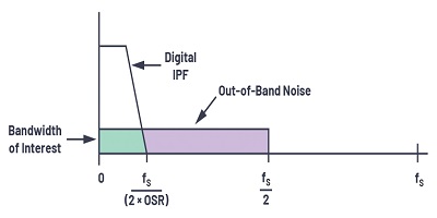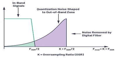 在理想的Nyquist ADC中,ADC的LSB大小將確定在進行模數轉換時添加到輸入的量化噪聲。該量化噪聲分布在fS / 2的帶寬上。為了對抗量化噪聲,第一種技術是過采樣,即以比奈奎斯特頻率高得多的速率采樣輸入信號,以提高信噪比(SNR)和分辨率(ENOB)。在過采樣中,采樣頻率選擇為Nyquist頻率(2×fIN)的N倍,結果,現在相同的量化噪聲必須在N倍Nyquist頻率上擴展。這也放寬了對抗混疊濾波器的要求。過采樣率(OSR)定義為fS / 2fIN,其中fIN是感興趣的信號BW。作為一般準則,對ADC進行四倍的過采樣可提供額外的分辨率,或動態范圍增加6 dB。增加過采樣率將導致整體噪聲降低,并且由于過采樣而導致的動態范圍(DR)改善為ΔDR= 10log10 OSR,以dB為單位。
