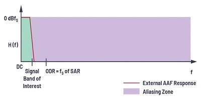 為了在高性能應用中消除混疊,使用了更高階的抗混疊濾波器來避免任何數量的折返。抗混疊濾波器是一種低通濾波器,其帶寬限制了輸入信號,并確保信號中沒有超出可以折返的目標帶寬的頻率分量。濾波器的性能將取決于帶外信號與fS / 2的接近程度以及所需的衰減量。