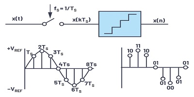 數據的數字化涉及采樣和量化的兩個基本過程,如圖1所示。采樣是第一步,其中使用采樣將連續時間變化的模擬信號x(t)轉換為離散時間信號x(n)。頻率fS。結果平均間隔為1 / TS(fS = 1 / TS)。