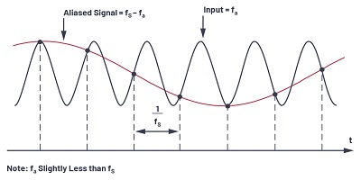 現在考慮信號在圖3中第一個Nyquist區域之外的情況。信號頻率僅略小于采樣頻率,這與圖2時域表示中所示的條件相對應。請注意,即使信號在第一個奈奎斯特區域之外,其圖像(或別名)fS – fa落在內部。返回圖3,很明顯,如果一個不想要的信號出現在fa的任何鏡像頻率上,它也會出現在fa上,從而在第一奈奎斯特區中產生一個雜散頻率分量。