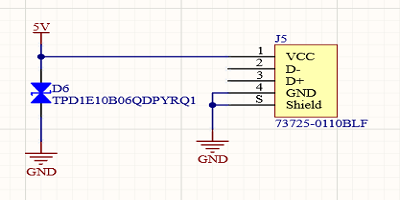 除了電源濾波之外,我還為每個輸入添加了一些基本的ESD保護。如果像許多貿(mào)易展覽會場館一樣跪在地毯上,準備好相機準備插入設(shè)備時會積聚靜電,這很容易導(dǎo)致ESD事件損壞相當昂貴的設(shè)備。通過在輸入端和穩(wěn)壓器板上提供ESD保護,我們應(yīng)該為攝像機提供相當高的保護等級。我在主電源板上使用的5v線路使用的是相同的0402尺寸TVS二極管TI TPD1E10B06QDPYRQ1。這些雖然很小,但具有汽車認證資格,并且可能能夠在中高濕度條件下處理海平面上的ESD事件。