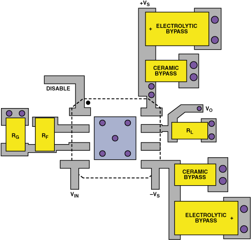 (圖11.AD8045低失真運算放大器的印刷電路板布局.)