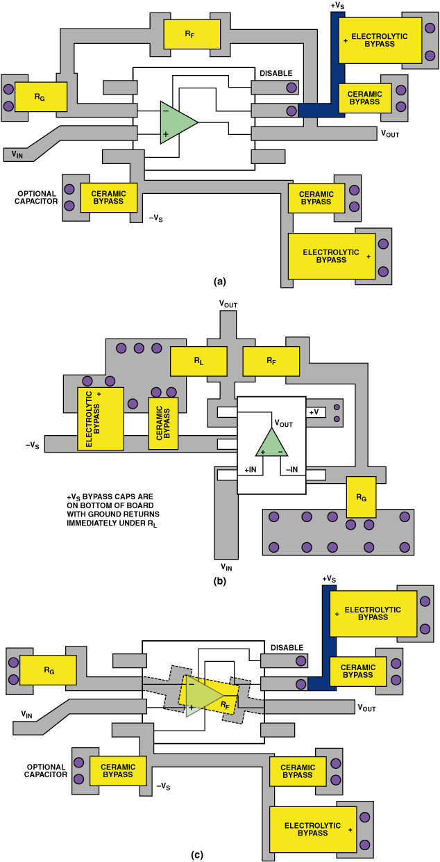 對于高速運算放大器和任何其他高速電路,繞過放大器的電源端子以最小化噪聲是PCB設(shè)計過程的一個關(guān)鍵方面。有兩種常用的繞過高速運算放大器的配置。