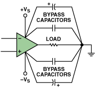 軌對軌:另一種配置是使用一個或多個旁路電容器連接在運放的正負電源軌之間。當電路中的四個電容都很難得到時,通常使用這種方法。這種方法的一個缺點是電容器外殼尺寸可能變大,因為通過電容器的電壓是單電源旁路方法的兩倍。更高的電壓需要更高的擊穿額定值,這轉(zhuǎn)化為更大的外殼尺寸。然而,此選項可以改善PSR和失真性能。
