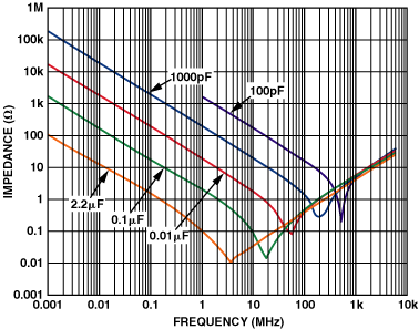 并聯(lián)不同的電容值有助于確保電源管腳在寬頻帶上看到低交流阻抗。這在運放電源抑制(PSR)逐漸消失的頻率下尤為重要。電容有助于補償放大器的PSR下降。在多個的頻率內(nèi)保持低阻抗接地路徑將防止不需要的噪聲進入運放。圖1顯示了多個并聯(lián)電容器的優(yōu)點。在較低的頻率下,較大的電容器提供一個低阻抗的接地路徑。一旦這些電容器達到自諧振,電容質(zhì)量下降,電容器成為電感。這就是為什么使用多個電容器很重要的原因:當一個電容器的頻率響應衰減時,另一個電容器的頻率響應變得明顯,從而在多個的頻率內(nèi)保持低交流阻抗。