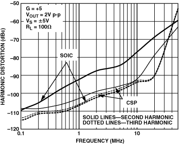 (圖12.AD8099失真比較相同的運算放大器在SOIC和LFCSP封裝.)