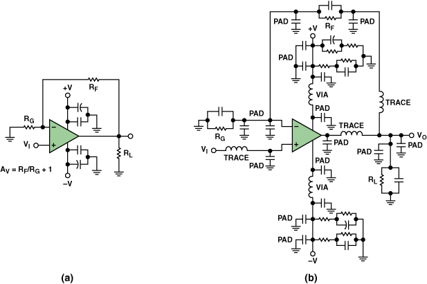 寄生效應會對你的電路中造成嚴重破壞。它們是隱藏在高速電路中的雜散電容和電感。它們包括由封裝引線和多余的布線長度形成的電感器;焊盤對地、焊盤對電源平面和焊盤對跡線電容器;與過孔的相互作用,以及更多的可能性。圖3(a)是一個典型的非旋轉(zhuǎn)運放的示意圖。然而,如果要考慮寄生元件,同一電路將如圖3(b)所示。