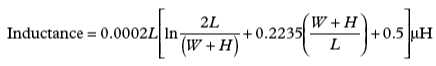 條帶狀電感是另一個需要考慮的寄生因素,它是由線長過長和缺少接地平面引起的。公式2給出了跟蹤電感的公式。見圖6。