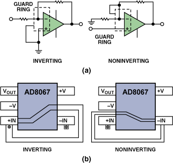 保護環(huán),或稱“保護”,是與運放一起使用的另一種常見的屏蔽類型;它用于防止雜散電流進入敏感節(jié)點。其原理很簡單,就是用保護導體完全包圍敏感節(jié)點,保護導體與敏感節(jié)點保持在或驅(qū)動到(低阻抗)相同的電位,從而從敏感節(jié)點吸收雜散電流。圖15(a)顯示了反向和非反向運算放大器配置的保護環(huán)示意圖。圖15(b)顯示了SOT-23-5包的兩個保護環(huán)的典型實現(xiàn)。
