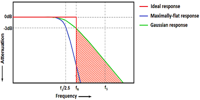 對(duì)于紅色曲線(xiàn),ADC輸入頻率響應(yīng)恰好在奈奎斯特頻率處被截?cái)唷1M管您可以通過(guò)正確的過(guò)濾器集來(lái)接近,但這種理想的行為無(wú)法物理再現(xiàn)。大多數(shù)ADC的實(shí)際行為對(duì)于經(jīng)常使用示波器的人們是熟悉的。響應(yīng)是高斯或類(lèi)似高斯的。處理PCB中的寬帶信號(hào)的一個(gè)更好的選擇是選擇一個(gè)帶寬接近藍(lán)色曲線(xiàn)的ADC。在這里,我們有一個(gè)“有效”奈奎斯特頻率,等于Fs / 2.5。