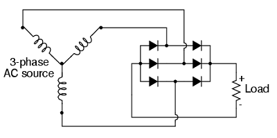 對于將使用交流電源運行但需要直流電動機或步進電動機的更復雜的系統,您可能需要具有開關調節器的功率因數校正(PFC)電路,以確保向機電系統提供穩定的電流和高效的功率傳輸系統。為了從單相電源轉換為脈動DC,可以使用帶有輸出電容器的標準整流器電路。要將三相電源轉換為直流電源,請使用以下電路。