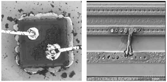 EOS故障(左圖)與單個晶體管的ESD故障(右圖)相比。請注意,ESD故障會在集電極和發射極區域之間造成短路。