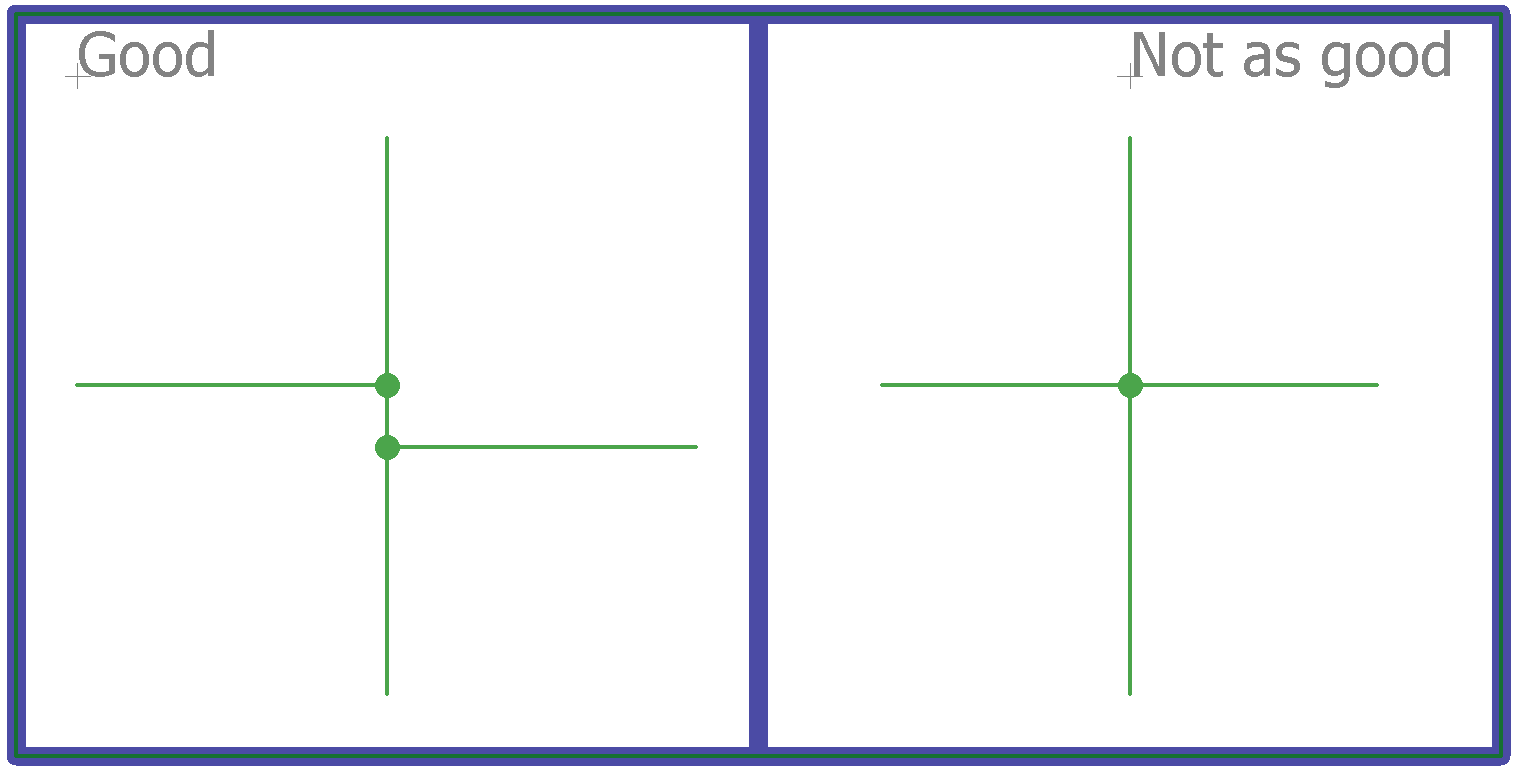 你可以看到有和沒有連接點的一組重疊和連接的網絡。當添加相交的結點,還建議避免四通,因為這可能會增加讀取電路時的混亂。而是選擇一組共享的交叉點,如下圖所示,其中每個交叉點都有自己的唯一連接。這樣可以更輕松地準確理解正確的連接并避免誤解。