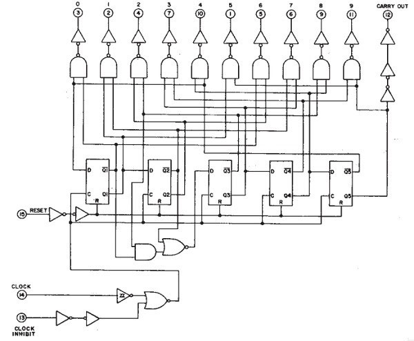 這可能還不清楚,但是如果您看一下CD4017 IC的內(nèi)部結(jié)構(gòu),就會(huì)發(fā)現(xiàn)它實(shí)際上是使用與門,或非門,反相器,觸發(fā)器和緩沖器構(gòu)造的。