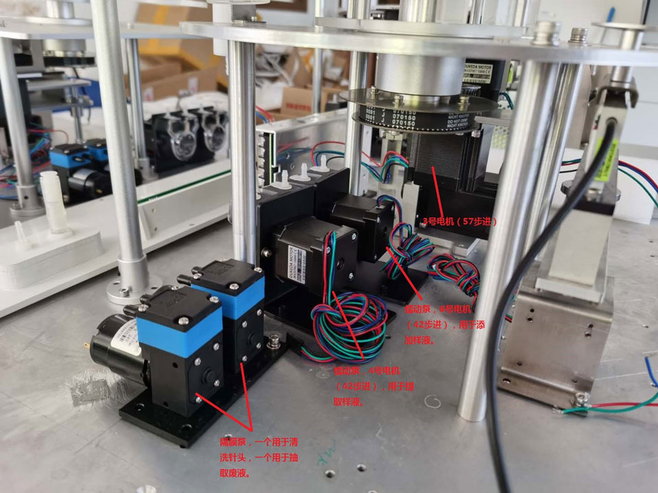 注:本臺儀器有6個電機,2個蠕動泵,2個隔膜泵。一個蠕動泵是加樣液用,另一個蠕動泵是連接旋轉臂,提取及注射樣液用。一個隔膜泵是抽取廢液(清洗取樣針的液體)用,一個隔膜泵清洗針頭。